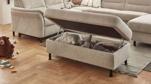 • Die Abbildung zeigt ein Wohnbeispiel, welches auch Dekoration sowie separat erhältliches Zubehör enthält. Im Lieferumfang enthalten ist ein Einsitzer-Kombielement mit Anstellhocker links, ein 2,5-Sitzer-Zwischenelement ohne Armlehnen und ein Canapé mit Armlehne rechts.