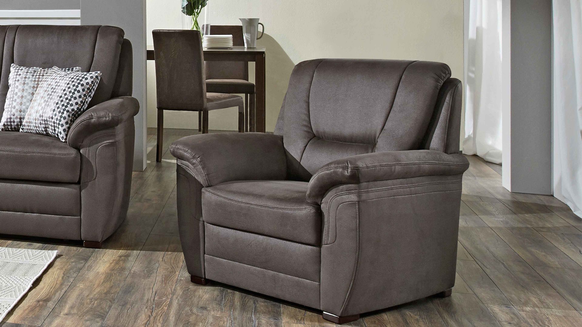 Ergänzen Sie Ihre Sitzgruppe mit dem ca. 100 x 92 x 95 cm (BxHxT) großen Polstermöbel, an dem Ihre ganze Familie Freude hat. Der Rücken des Sessels ist stoffbezogen, während eine Super-Bonnellfederkernpolsterung den Sitzkomfort erhöht.