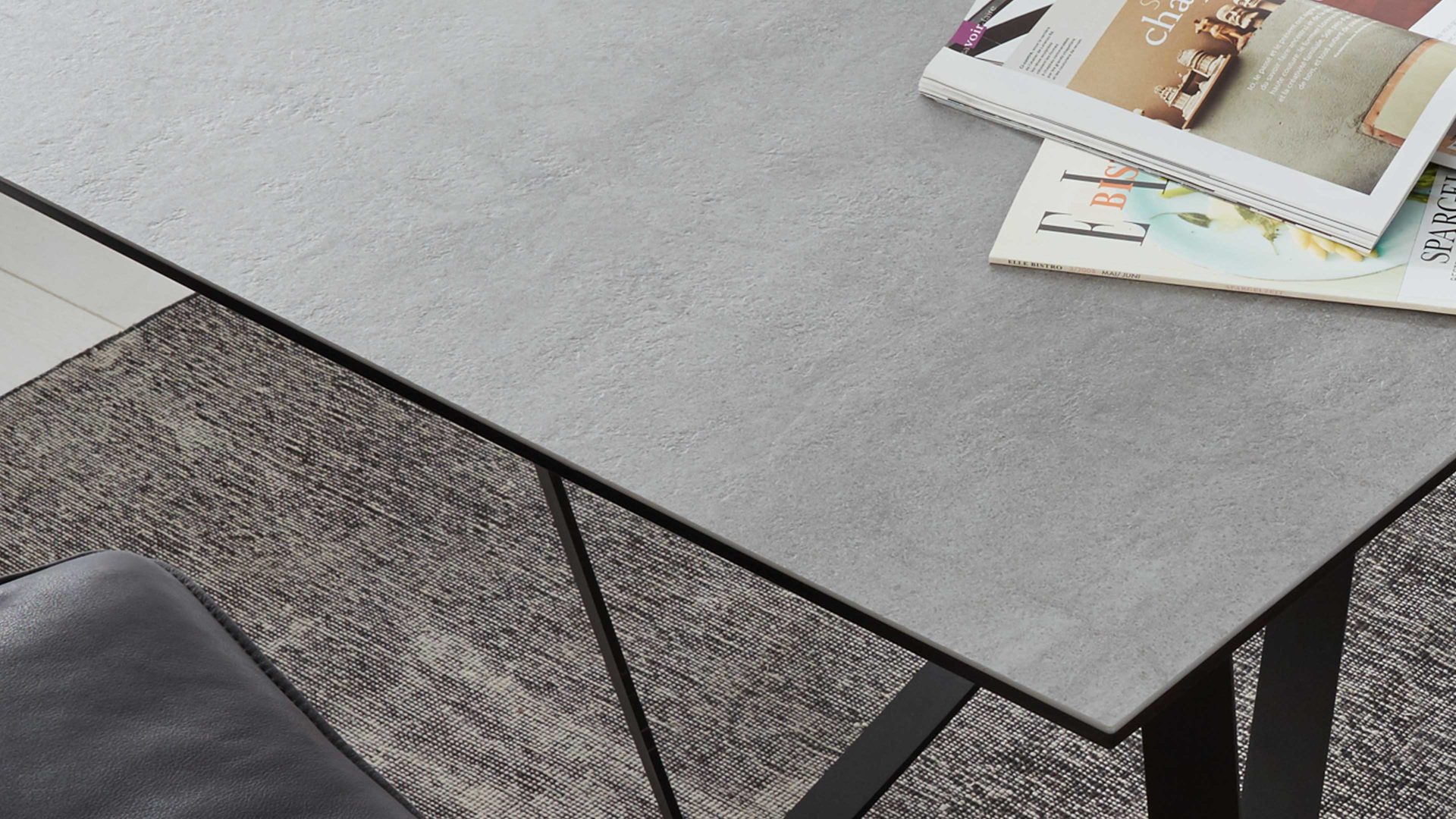 Als Basis fungieren ein mattschwarz pulverbeschichtetes Flachkufengestell mit Struktur sowie ein UV-beschichteter Wildeichen-Massivholzbügel mit Öl-Effekt, der für eine natürlich-warme Note sorgt. Die anthrazitfarbene Keramiktischplatte begeistert visuell und ist zudem widerstandsfähig und belastbar, lichtbeständig, hygienisch und pflegeleicht.