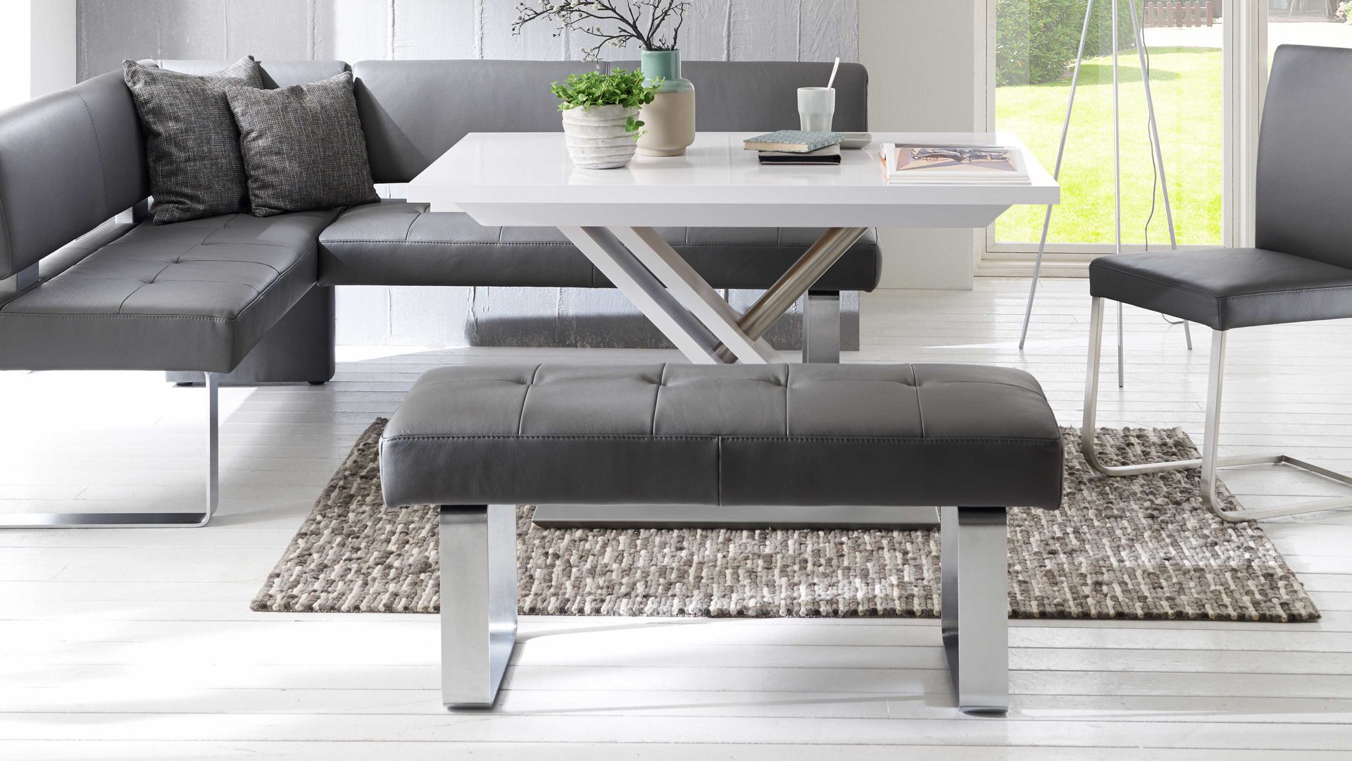 Als kompaktes Sitzmöbel leistet Ihnen die Hockerbank in der Küche oder im Esszimmer gute Dienste. Laden Sie Ihre Freunde und Familie zu einer geselligen Runde ein und genießen Sie hohen Sitzkomfort auf dieser Polsterbank, die ein echter Blickfang ist. Der Longlife-Dicklederbezug in Grau ist elegant und robust.