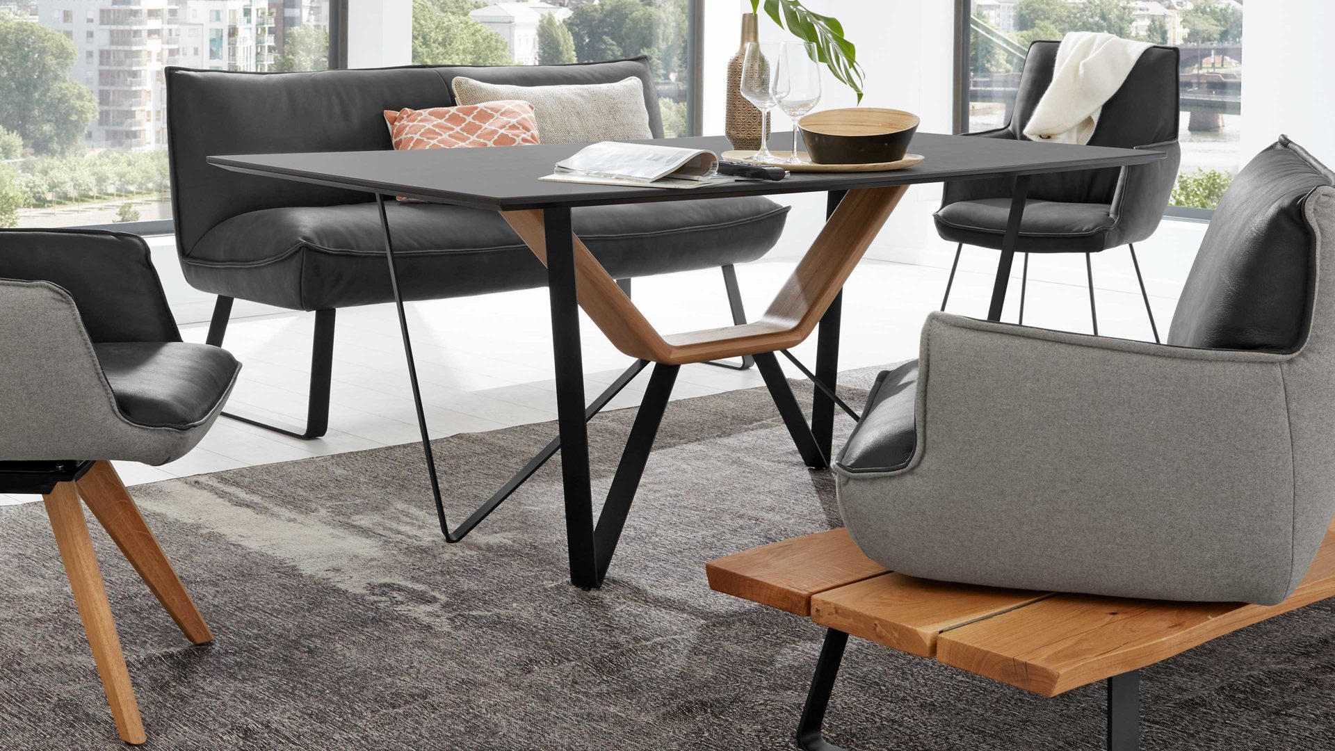Als Basis fungieren ein mattschwarz pulverbeschichtetes Flachkufengestell mit Struktur sowie ein UV-beschichteter Wildeichen-Massivholzbügel mit Öl-Effekt, der für eine natürlich-warme Note sorgt. Die anthrazitfarbene Keramiktischplatte begeistert visuell und ist zudem widerstandsfähig und belastbar, lichtbeständig, hygienisch und pflegeleicht.