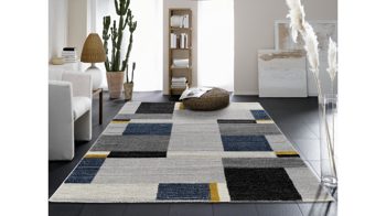 Moderne Mosaikstruktur in angenehm-dezenten Farbverläufen. Mit geometrisch angeordneten Vierecken verschiedener Größe und Kolorierung gehört der Designerteppich Castle Beppo zu den Wohnaccessoires, die für Form- und Farbenvielfalt sorgen und dabei eine gleichmäßige Struktur und ein harmonisches Karreefeld erzeugen. Der Webteppich ist seitlich gekettelt und vor Kopf umgeschlagen.