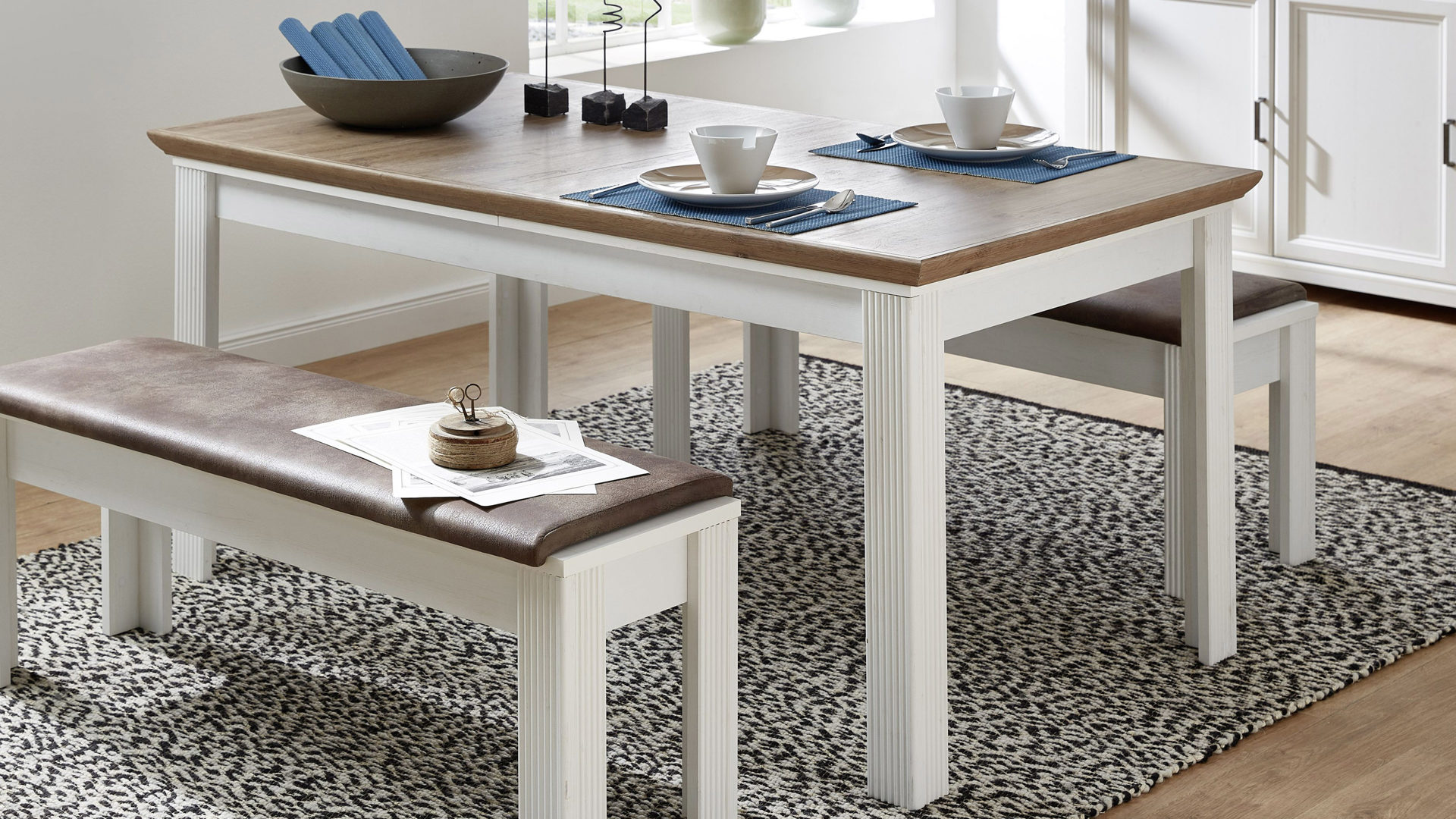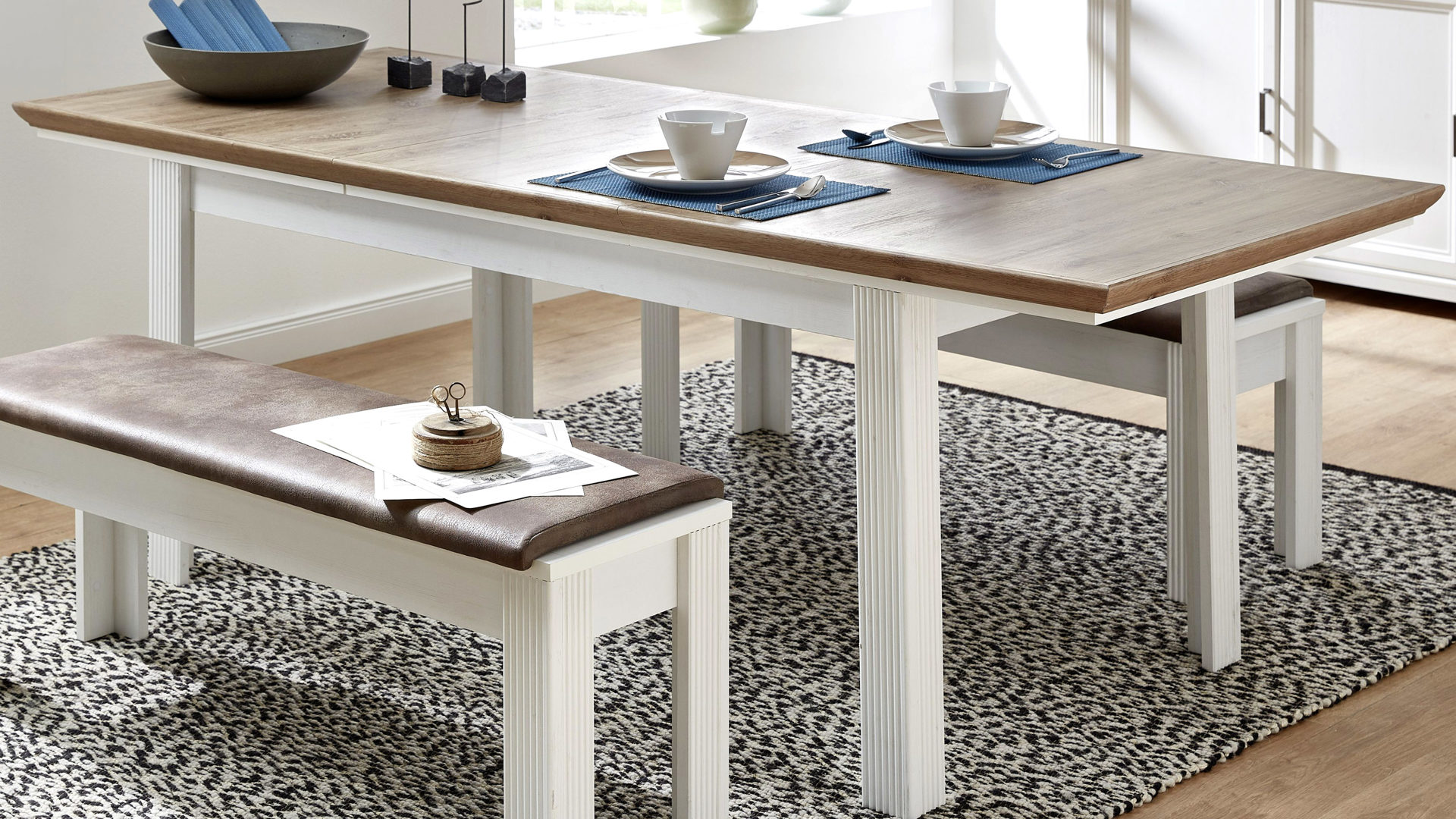 Der Auszugtisch Jasmin kombiniert helle pinienfarbene Kunststoffoberflächen mit Details in Artisan-Eiche-Nachbildung. Durch diese äußerst spezielle Optik strahlt er antikes Flair aus und bringt ein freundlich-elegantes Ambiente in Ihren Raum.
