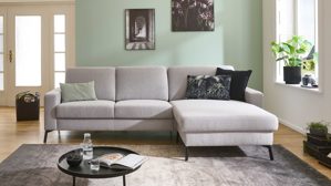 mit Federkern-, Tonnentaschenfederkern- oder softer Kaltschaumpolsterung und mit verschiedenen Armlehn- und Fußvarianten lieferbar