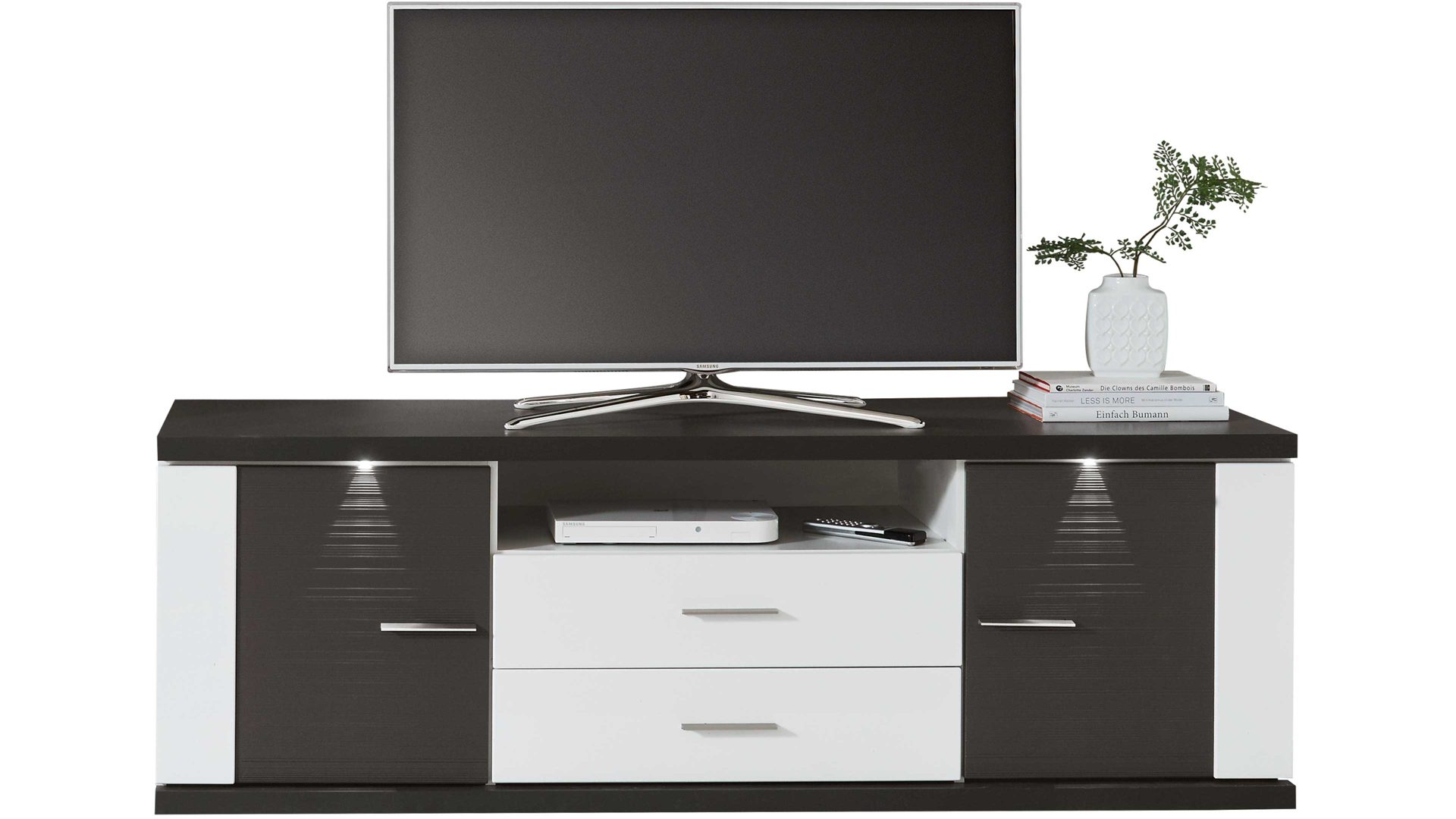 Tolles Lowboard für Ihr Zuhause: Mit arcticweißen Hochglanzfronten und Absetzungen mit graphitfarbener Kunststoffoberfläche besticht dieses raffinierte Medienelement als Wohnmöbel. Der Korpus verfügt über arcticweiße Melaminoberflächen, die nicht nur stoß- und kratzfest, sondern auch lichtbeständig sind. Das Medien-Lowboard bietet mit zwei Schubladen, und zwei Türen, hinter denen sich jeweils ein Holzboden verbirgt, jede Menge Platz für Ihre Unterhaltungselektronik.