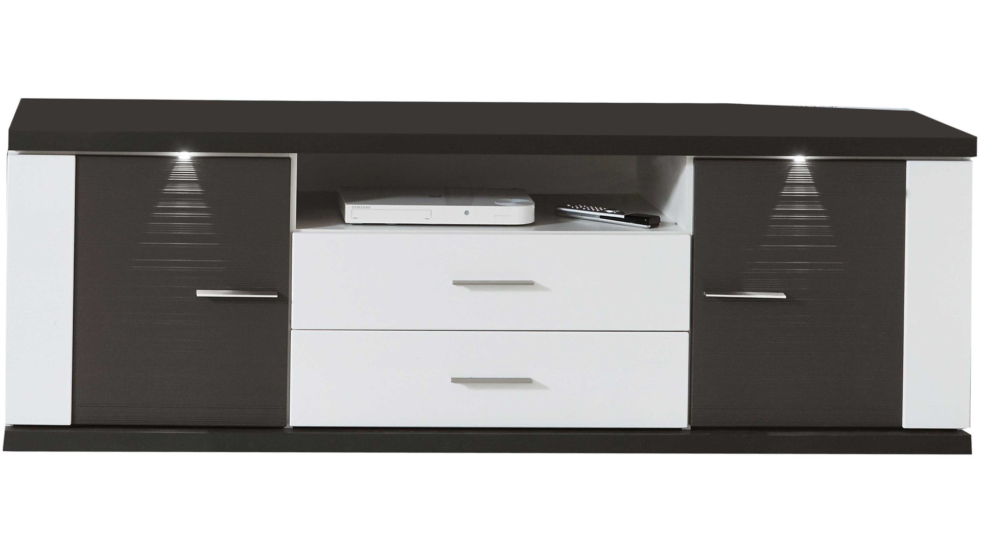 Tolles Sideboard für Ihr Zuhause: Mit arcticweißen Hochglanzfronten und graphitfarben geschroppten Absetzungen besticht diese raffinierte Stauraumlösung als Wohnmöbel. Der Korpus verfügt über arcticweiße Melaminoberflächen, die nicht nur stoß- und kratzfest, sondern auch lichtbeständig sind. Die Kombikommode, hinter deren zwei Türen sich jeweils ein Holzboden verbergen, ist bereits mit Front-LED-Beleuchtung ausgestattet. In fünf Schubladen mit Soft-Close-Dämpfung findet sich weiterer Stauraum. In diesem Aufbewahrungsmöbel bringen Sie Gläser, Vasen, Bücher und Wohnaccessoires ordentlich und staubfrei unter.
