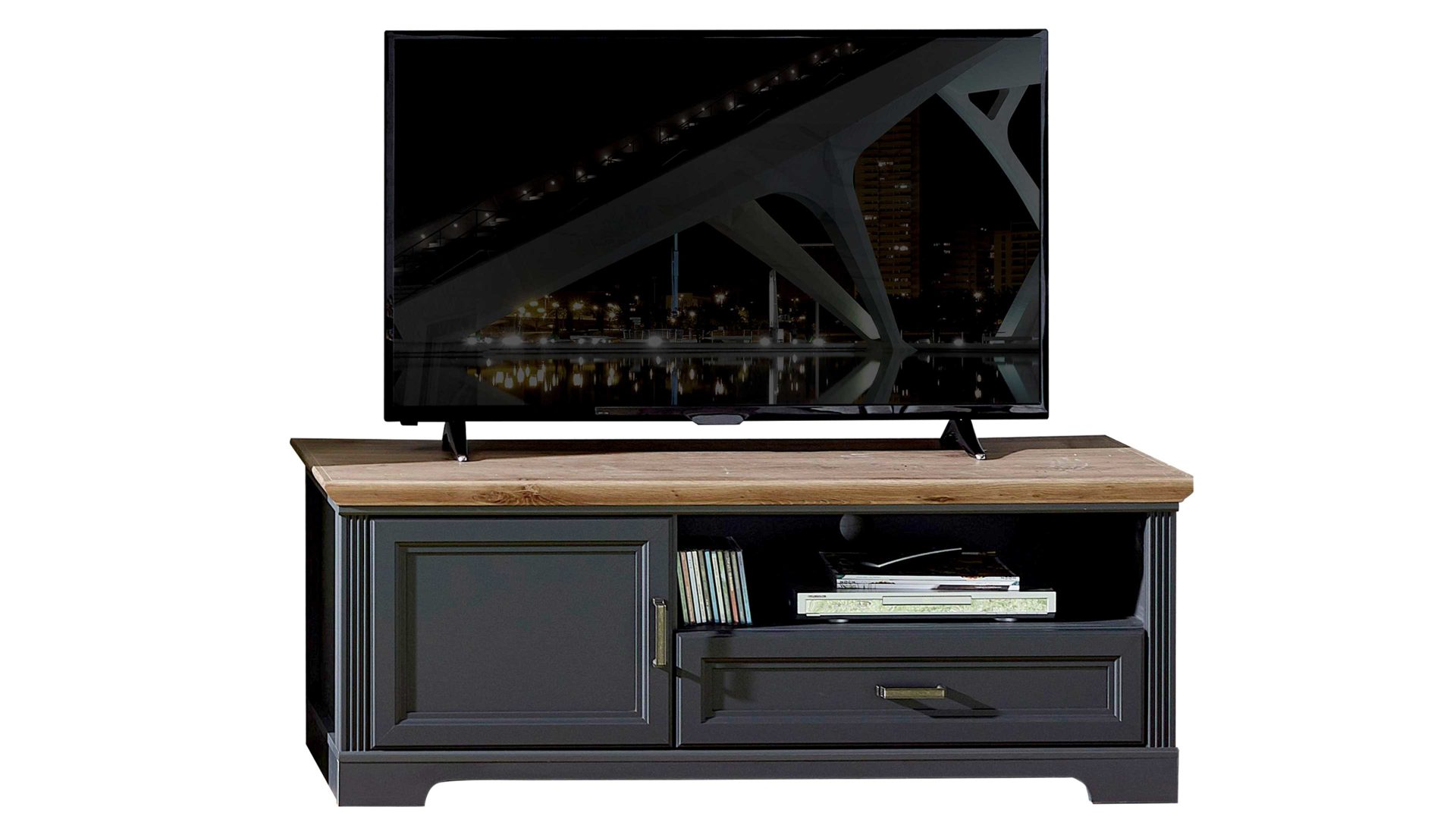 Auch funktional überzeugt das Medienmöbel auf ganzer Linie. Es beherbergt eine Holztür mit einem Holzboden und eine Schublade mit Selbsteinzug, sodass Sie viel Stauraum für licht- und staubempfindliche Gegenstände haben. Sowohl die Türen als auch die Schublade sind mit Softclose ausgestattet - für ein angenehm leises Schließen. Neben den geschützten Aufbewahrungsmöglichkeiten gehört noch ein offenes Fach zum Medien-Lowboard Jasmin. Darin können Sie beispielsweise Ihren DVD- oder Blu-ray-Player platzieren.