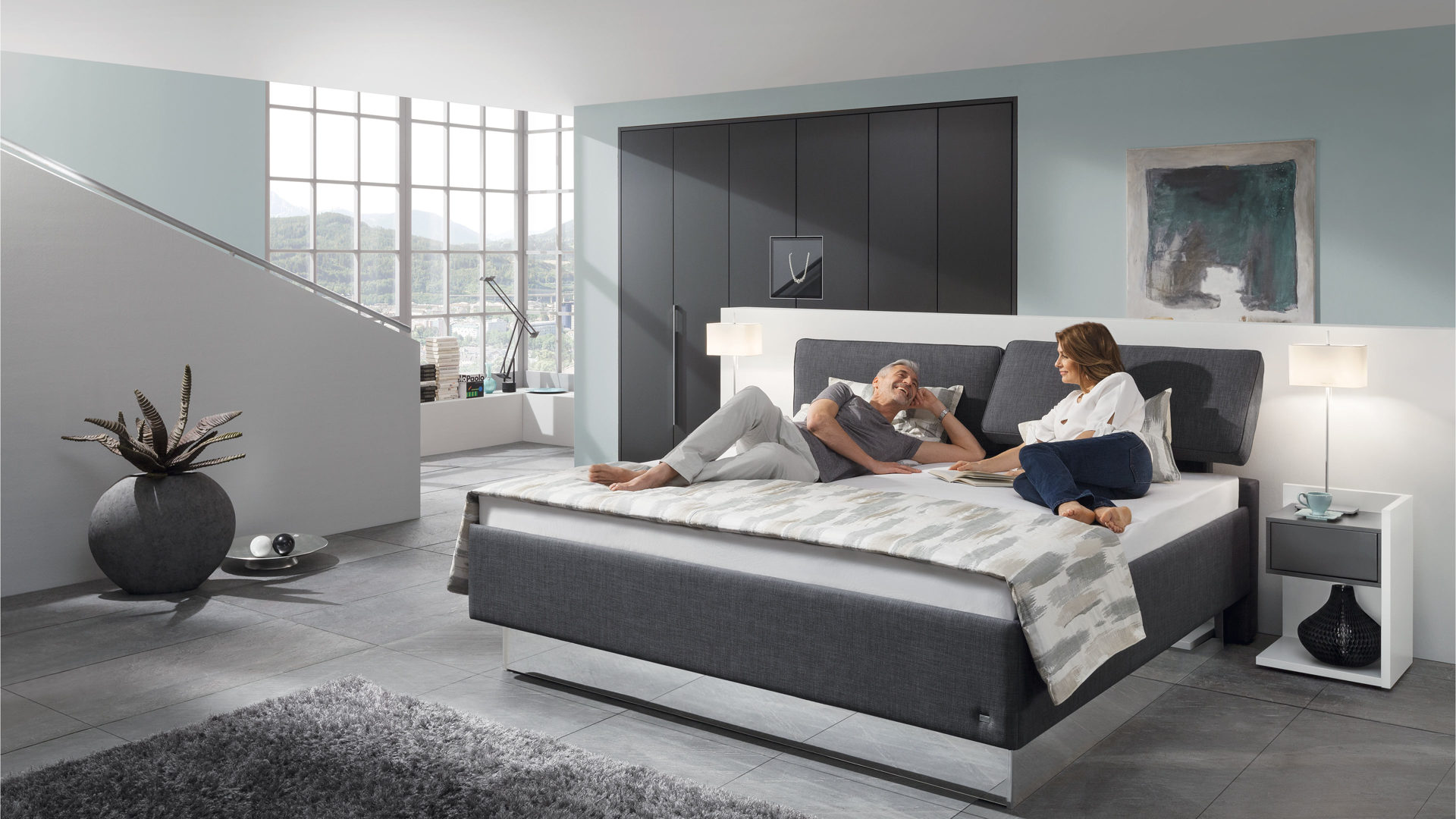 Dieses Polsterbett von rUF BETTEN ist modern designt und bietet Ihnen ein hohes Maß an Liegekomfort. Mit dem dunkelgrauen Stoffbezug strahlt es klassische Eleganz aus. Einen echten Höhepunkt bildet der Bettunterbau mit Spiegelsockel in Super-Komforthöhe. Die verspiegelten Oberflächen verleihen dem Doppelbett das gewisse ungewöhnliche Etwas.