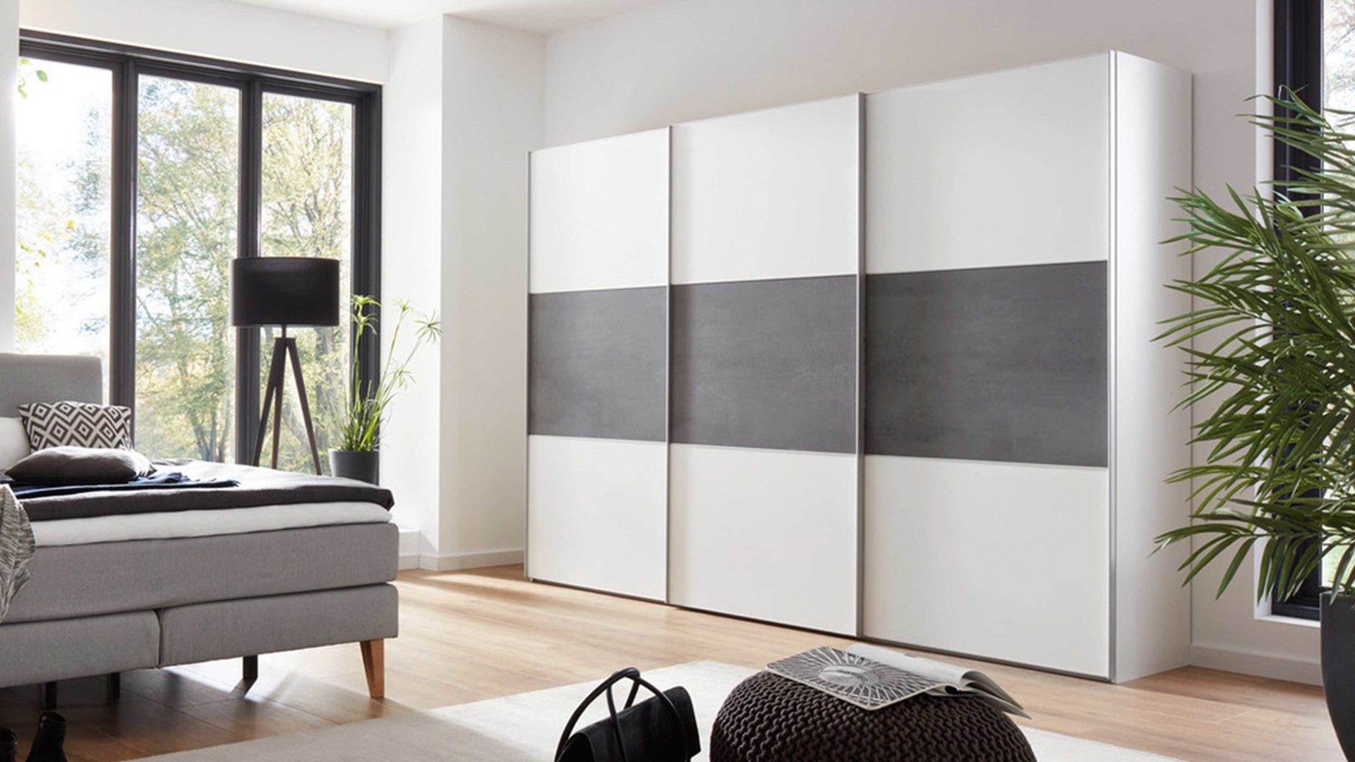 Der hochwertige STAUD Schwebetürenschrank Includo kombiniert klassisch weiße und edel-oxidfarbene Kunststoffoberflächen mit alufarbenen Griff- und Zierleisten zu einem stimmigen Ganzen.