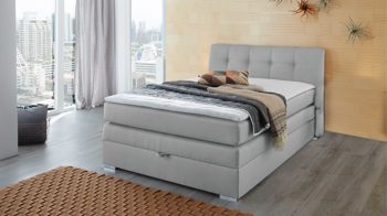 Dieses hochwertige Boxspringbett wird Sie träumen lassen. Der hellgraue Feinstrukturbezug passt perfekt zu kräftigen Farben oder einer modernen Schlafzimmereinrichtung. Ihr neues Polsterbett steht elegant auf seinen chromfarbenen Füßen und hat eine Bettkastenbox mit Bonnellfederkern. Betten Sie sich in Ihrem neuen Polsterbett auf einer Obermatratze mit Bonnellfederkern und auf einer Liegefläche von ca. 140 x 200 cm (BxL).