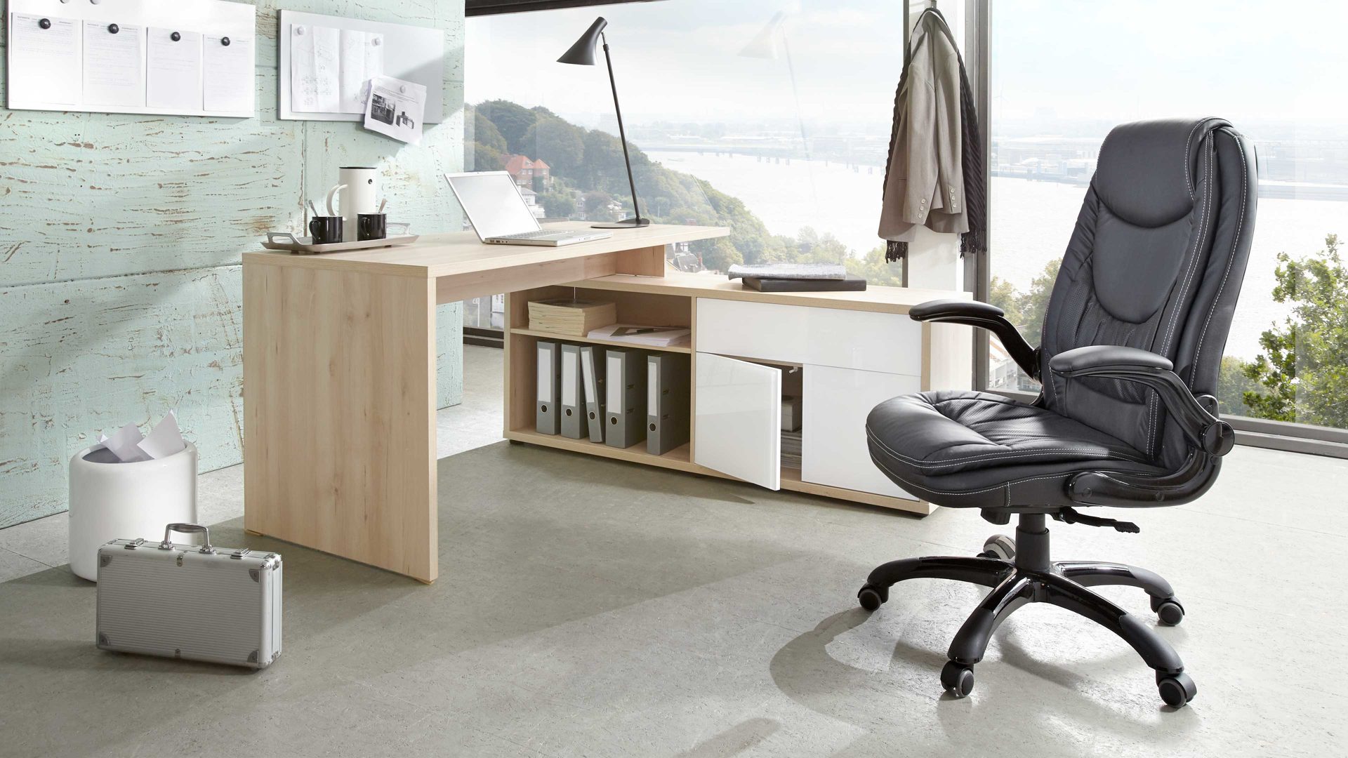 Sein hochwertiger Kunstlederbezug sowie das in Schwarz gehaltene Drehkreuz und die Armlehnen sorgen dafür, dass diese funktionale Sitzgelegenheit Ihren hohen Anforderungen standhält. Die hochglänzenden schwarzen Amlehnen lassen sich nicht nur hochklappen, sie sind auch für eine entspannte Armhaltung bequem gepolstert.