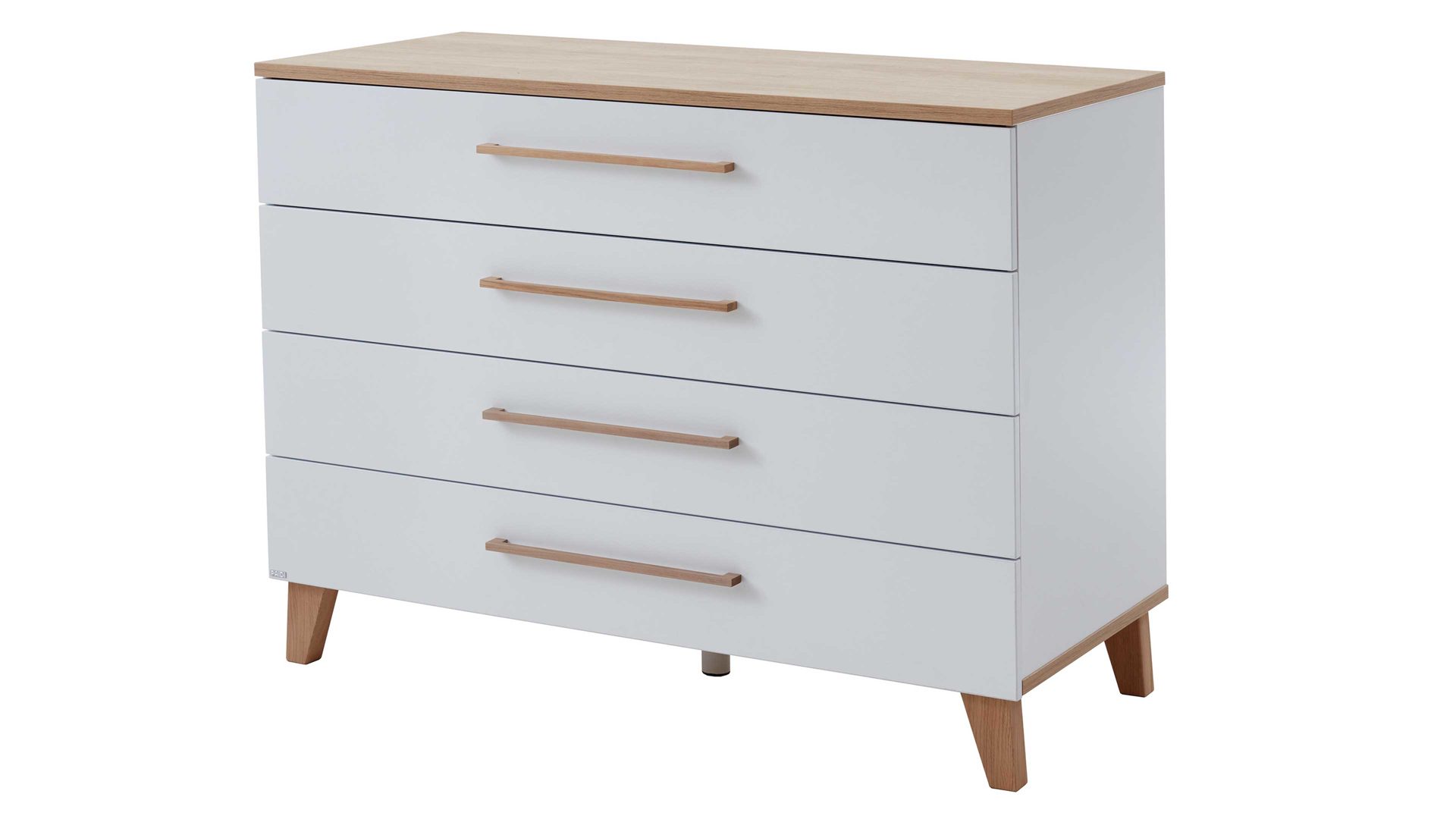 Funktional überzeugt die erstklassig verarbeitete Kommode mit vier Schubladen, von denen die oberste mit Vollauszug ausgestattet ist. Somit steht reichlich Stauraum für Unterwäsche, Bettwäsche, Handtücher und sonstige Textilien oder auch empfindliche Accessoires zur Verfügung, die licht- und staubgeschützt aufbewahrt werden sollen. Der Oberboden des Kommodenschranks bietet Platz für dekorative Elemente, etwa eine Vase oder einen Bilderrahmen mit persönlichem Foto. Gegen Mehrpreis ist der Schrank mit einem Schubladeneinsatz und einem Wickelaufsatz ergänzbar. Auf ca. 124 x 95 x 56 cm (BxHxT) belaufen sich die Maße der praktischen Schubladenkommode.