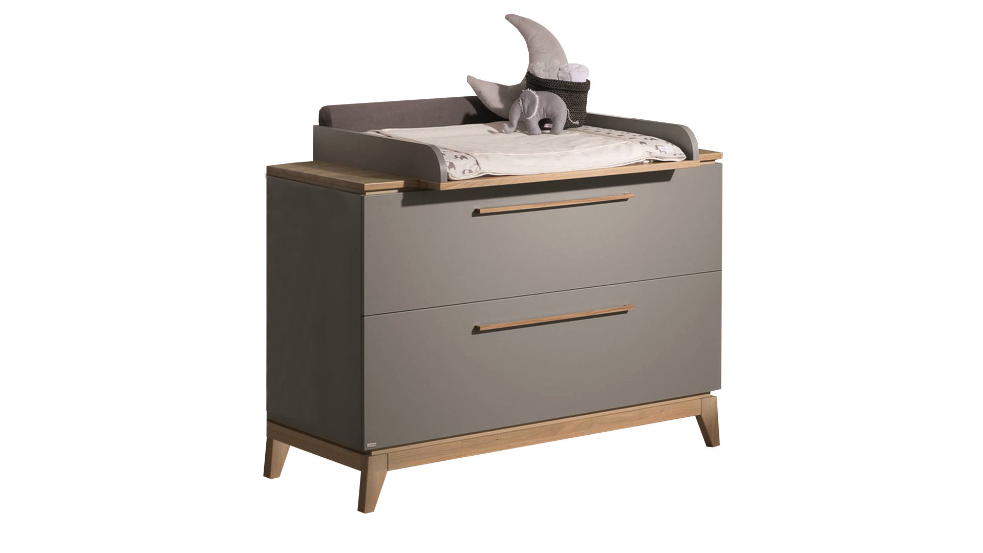 Das hochwertige Bettgestell des PAIDI Babyzimmers Sten kombiniert massive Eiche mit schiefergrauen Melaminoberflächen. Letztere zeichnen sich durch ihre Lichtechtheit sowie die besonders ausgeprägte Kratz- und Stoßfestigkeit aus. Überdies sind sie sehr pflegeleicht. Die massive Eiche begeistert mit ihrer extremen Robustheit und Stabilität. Zudem strahlt sie warme Natürlichkeit aus. Der Holzton harmoniert wunderbar mit dem Schiefergrau. Zusammen sorgen die Nuancen für eine moderne und elegante Optik.
