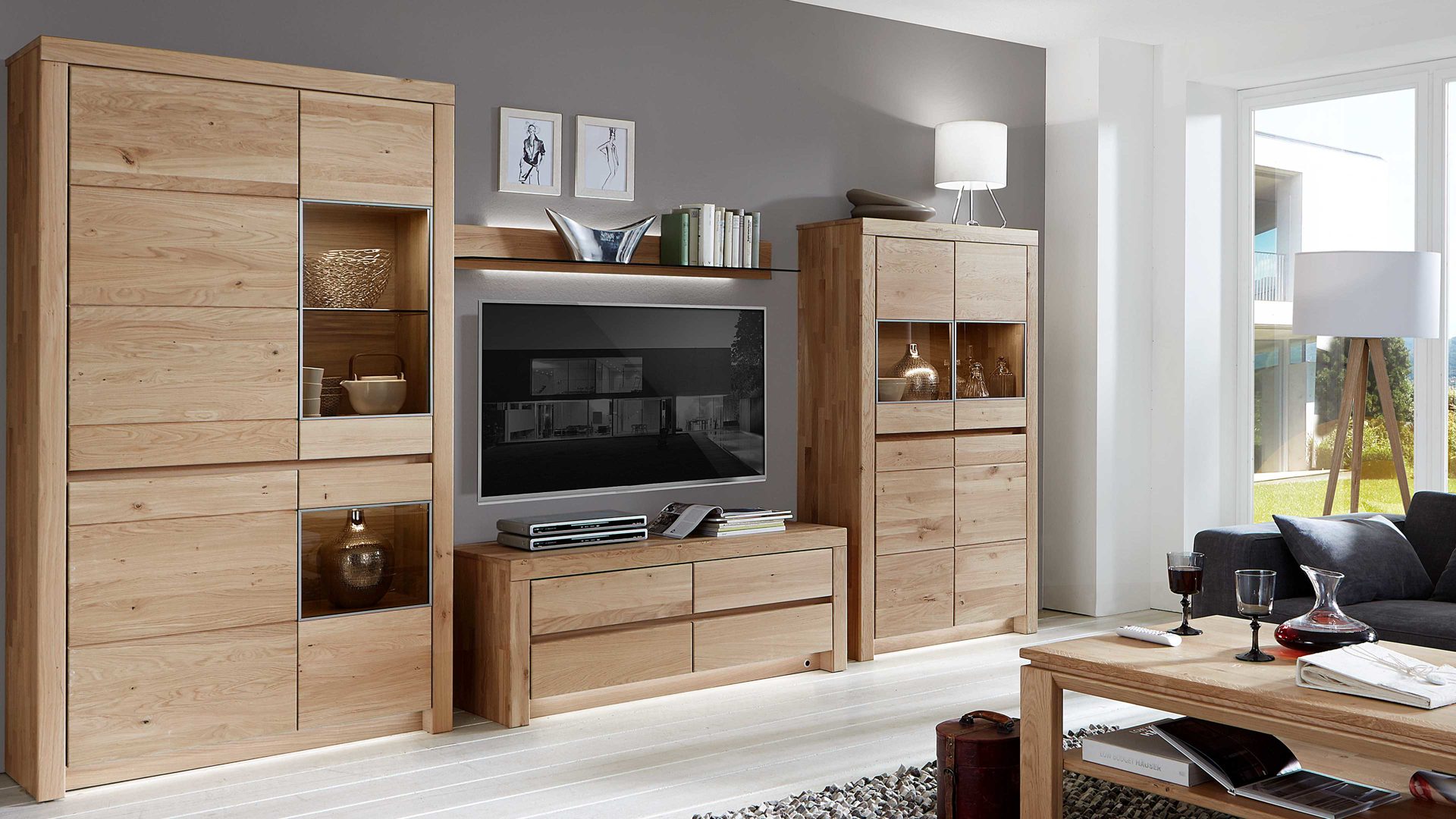 Die vierteilige Wohnkombination besteht aus einem Vitrinenschrank, einem Medienelement, einem Wandboard und einem Highboard. Alle Wohnzimmermöbel weisen einen Korpus in bianco geöltem Eichenfurnier sowie bianco geölte Eichenholz-Fronten mit Hirnholzapplikationen auf. Innen sind sie in Eiche-Nachbildung gehalten. Durch die natürliche Farbgebung bringt die Wohnwand einladend-warmes und gemütliches Flair in den Raum. Die gesamte Wohnkombination strahlt feine Eleganz aus. Diese Eigenschaft unterstreichen auch die grauen Parsolglaseinsätze der Vitrine und des Highboards. Stilvoll abgerundet wird die Wohnwand durch die matten Nickel-Metallgriffe.