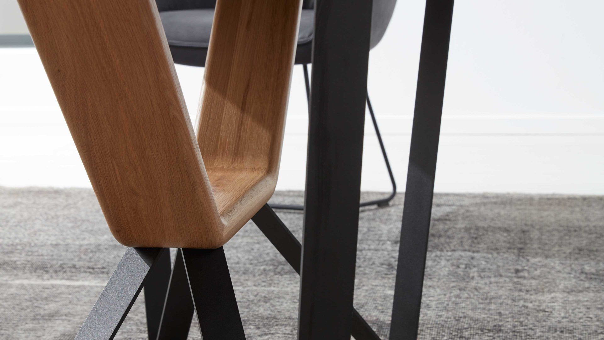 Als Basis fungieren ein mattschwarz pulverbeschichtetes Flachkufengestell mit Struktur sowie ein UV-beschichteter Wildeichen-Massivholzbügel mit Öl-Effekt, der für eine natürlich-warme Note sorgt. Die anthrazitfarbene Keramiktischplatte begeistert visuell und ist zudem widerstandsfähig und belastbar, lichtbeständig, hygienisch und pflegeleicht.