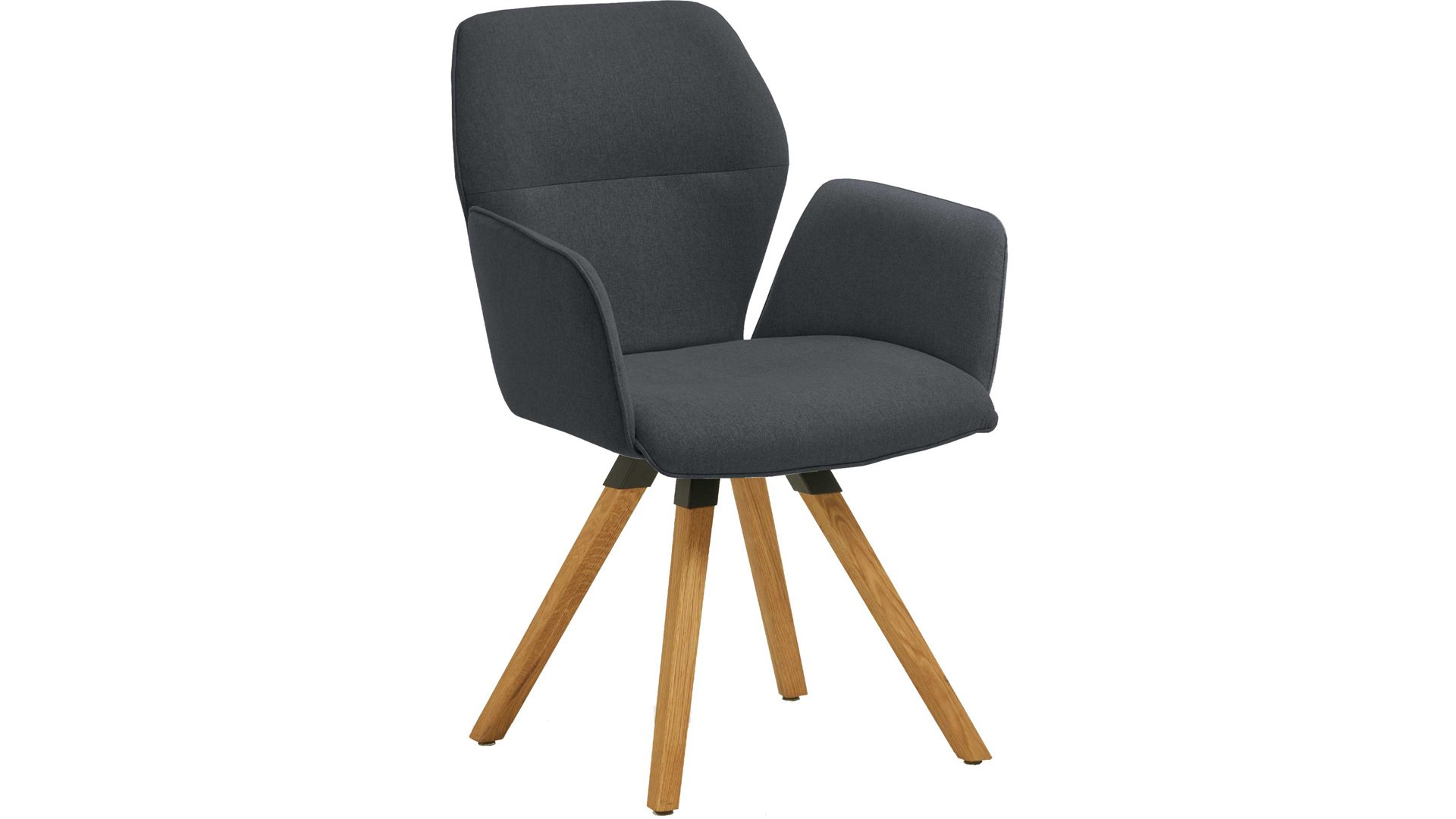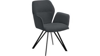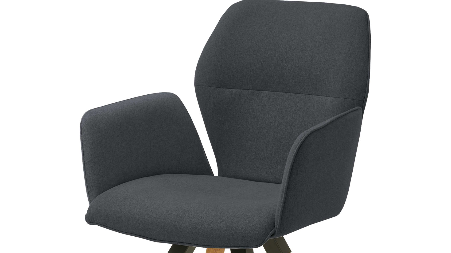 Er wirkt klassisch-schlicht, aber dennoch überraschend stilvoll. Dieses Modell verfügt über einen graphitfarbenen Webstoffbezug sowie über ein massives Wildeichenholz Stativ-Gestell. Eine weitere Besonderheit: Der Esszimmerstuhl ist um 180 Grad drehbar und mit einer Rückholfunktion ausgestattet.